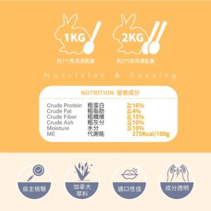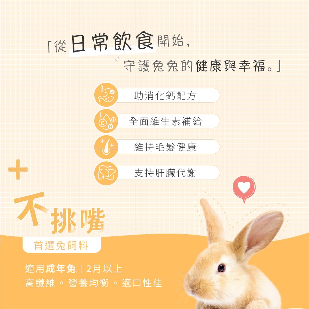代謝能 ——- 295Kcal/100g以下 - 適用寵物種類:所有成年兔(2個月以上)